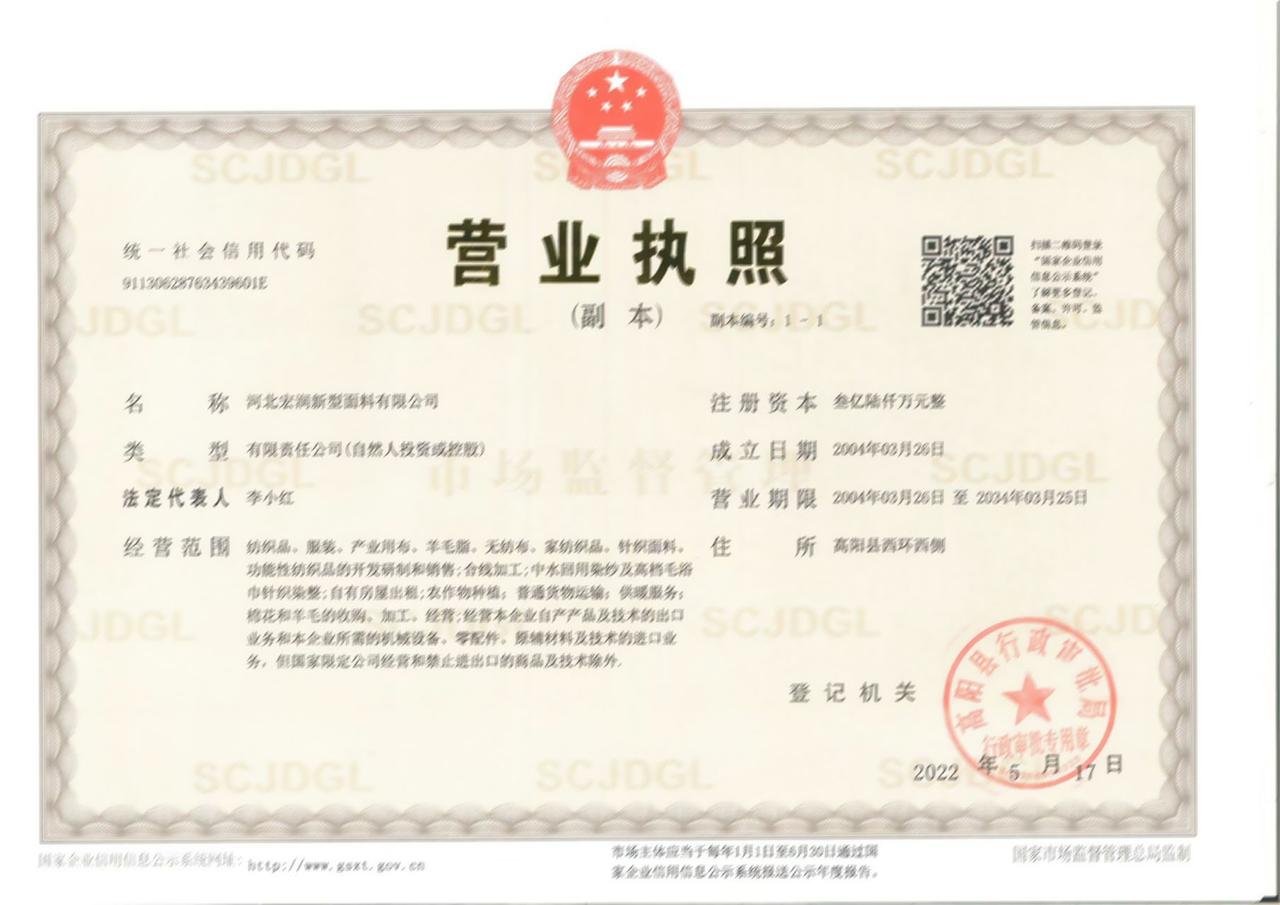 河北宏潤新型面料有限公司成立于2004年3月,現(xiàn)公司發(fā)展成為集紡紗、織造、成衣、染整、非織造、倉儲(chǔ)等全鏈條集團(tuán)。